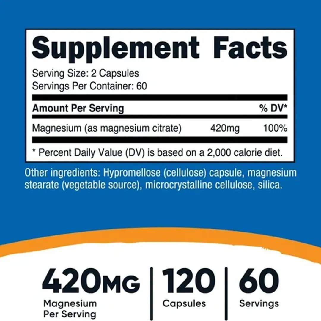 240 cápsulas de citrato de magnesio por frasco (60 porciones), 420 mg de magnesio (elemental) por porción, Cápsulas vegetales aptas para vegetarianos, Sin OGM, sin gluten, sin soja, Fabricado en una instalación que cumple con las normas GMP y está registrada por la FDA